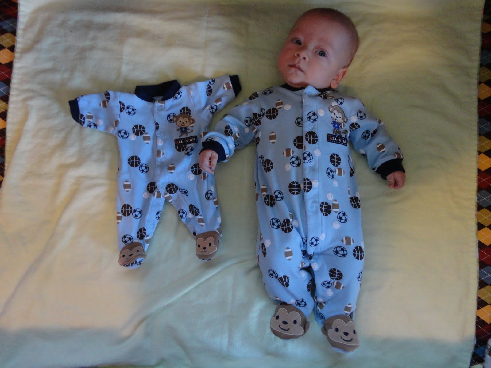 We found an outfit in Henry's new size (0-3 months) that we also had in a preemie size. I held up the two outfits to see how far he has come. What an awesome little guy!